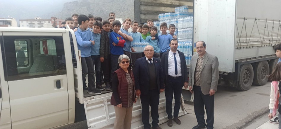 Kendi harçlıkları ve kumbaralarındaki paraları kampanyaya bağışlayan öğrenciler Hatay da bulunan çadır okullarındaki akranları için bir tır su gönderdi.