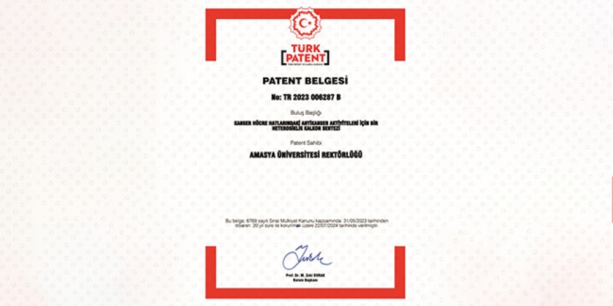Amasya Üniversitesi patent başarılarına bir yenisini daha ekledi. Amasya Üniversitesi Teknik Bilimler MYO Kimya ve Kimyasal İşleme Teknolojileri Bölümü Öğretim Üyesi Prof. Dr. Ayşe Şahin Yağlıoğlu, Gaziantep Üniversitesi Fen Edebiyat Fakültesi Kimya Bölümünden Prof. Dr. Emine Elçin Emre ve Malatya Turgut Özal Yeşilyurt MYO Saç Bakım ve Güzellik Hizmetleri Bölümü’nden Dr. Öğr. Üyesi Bedriye Seda Kurşun Aktar’ın ortak çalışmalarının ürünü olan "Kanser Hücre Hatlarındaki Antikanser Aktiviteleri İçin Bir Heterosiklik Kalkon Sentezi" başlıklı buluş Türk Patent ve Marka Kurumu tarafından Amasya Üniversitesi adına tescillendi.