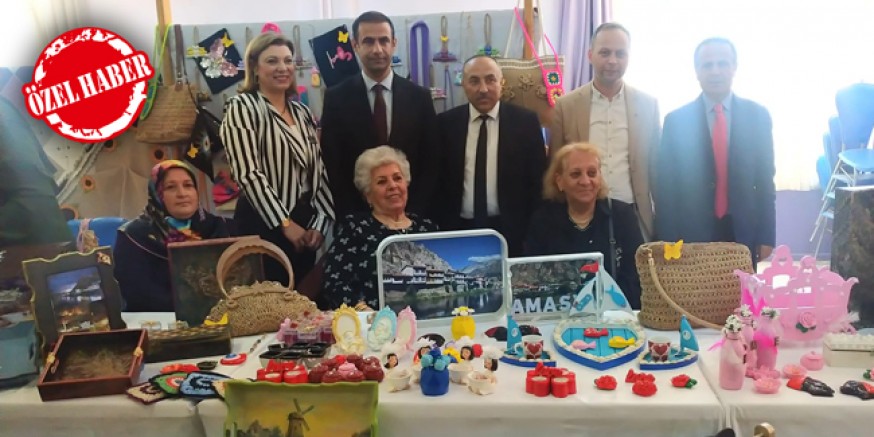 Amasya Borsa İlkokulunda açılan sergide 4 usta öğretici, 60 üzerinde kursiyerin nakış-iğne oyaları, giyim üzerine çalışmaları, dekoratif tablolar, el sanatları ve ahşap boyamaları büyük beğeni gördü.