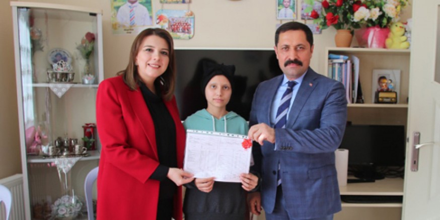Amasya Valisi Mustafa Masatlı 2022-2023 Eğitim Öğretim Yılının 1’nci döneminin sona ermesi ile beyin tümörü ameliyatı sonrası eğitimini evinde sürdüren Hicran Erdoğdu’ya (13) karnesini verdi.