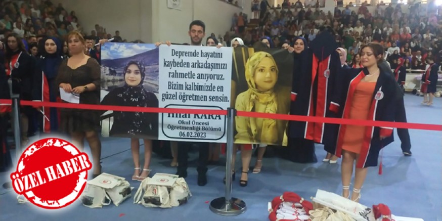 Amasya Üniversitesi mezuniyet töreninde öğrenciler, Kahramanmaraş merkezli depremde ölen arkadaşları Hilal Kara’nın fotoğraflarının yer aldığı pankart açtılar.