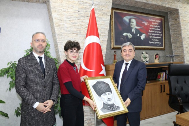 Amasya Güzel Sanatlar Lisesi öğrencisi Amasya İl Milli Eğitim Müdürü Mehmet Türkmen’i makamında ziyaret etti. Güzel Sanatlar Lisesi Okul Müdürü Korkut Şahin ile birlikte Müdür Türkmen’i ziyaret eden 10 sınıf öğrencisi 10 Kasım Atatürk'ü Anma Günü'nde tamamladığı Ata’m isimli kara kalem çalışmasını Türkmen’e hediye etti.
