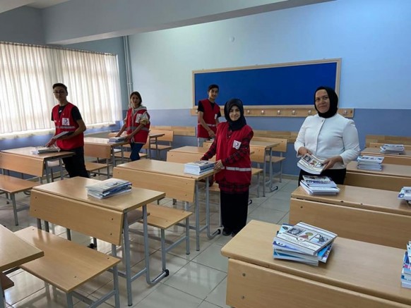 Uzun yaz tatilinin ardından okullarına kavuşacak öğrenciler için dağıtılan kitaplar Genç Kızılay Gönüllüleri tarafından Amasya Yeşilırmak Ortaokulunda öğrencilerin sıralarında hazır hale getirildi.