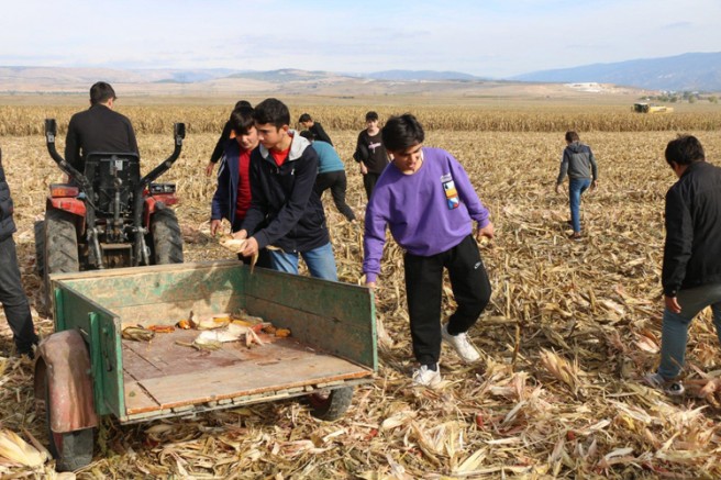 Projeye severek katılan öğrencilerimiz ile mısır hasadımızı gerçekleştirdik. Üreten gençlik sayesinde Tarım meslek lisemizin arazisinde buğday yetiştirip una dönüştüreceğiz, kendi unumuzdan da ekmek üretip nihayetinde süreci öğrenmeyle tamamlayacağız’ ifadelerini kullandı.