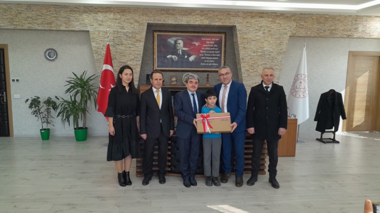 Amasya İl Milli Eğitim Müdürü Mehmet Türkmen ilkokul öğrencisi Özcan Veysel Dalakçı’ya yüce gönüllü davranışı için gönderilen bilgisayarı hediye etti.